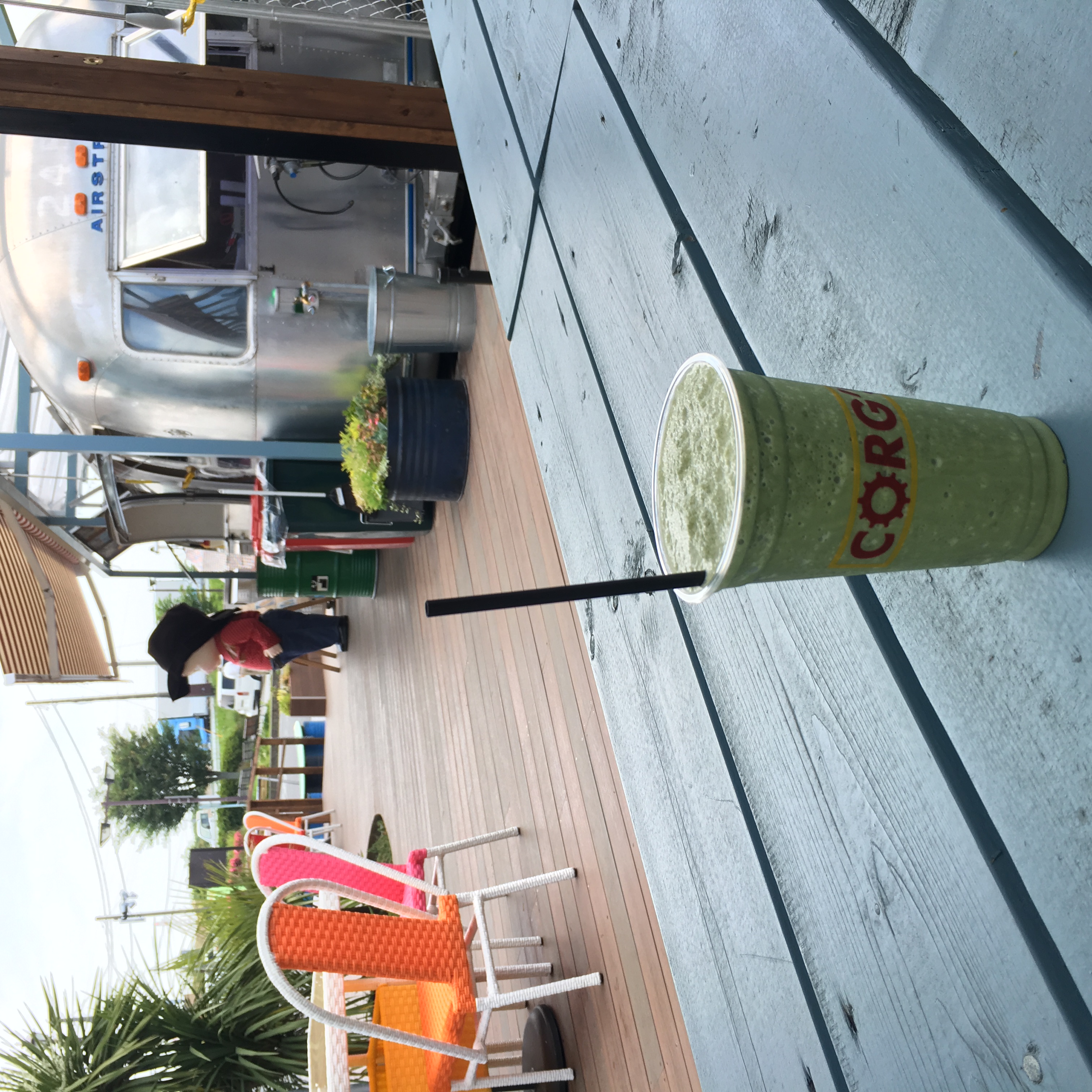 写真のドリンクがコラボメニューで、現地特産の緑茶とプロテイン入りのスムージー。